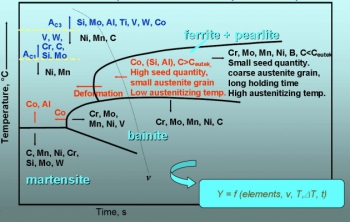Il modulo di QForm-Trattamento termico è un progetto di QuantorForm Ltd. e di GMT mbH Berlin, il modulo è continuazione del lavoro realizzato per il modulo QForm-Microstruttura. La base della simulazione di transizioni di fase è l’utilizzo delle curvature a forma di S interpolate per gli acciai di carbonio e per le leghe. Viene considerata l’influenza degli elementi di lega che spostano le curvature in relazione dal contenuto di questi elementi (ill. 1).